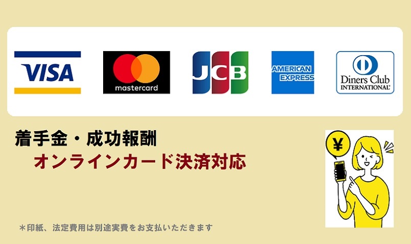 お客様サービス向上のひとつとしてクレジットカード(VISA・Master・AMEX・JCB・ダイナース)でのオンライン決済を導入しました。ご希望される方は当事務所からの着手金・成功報酬決済依頼メールの案内に沿って操作いただければお支払を簡単にすることができます。ご契約時に「クレジットカード払い」とお申し出ください。